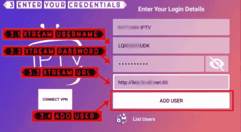 Step 4: Enter the Xtream connection details. In the first field, choose a name for your list (it can be any name), then enter your username, password, and the URL, and click on ADD USER.( Contact IPTVSAFRICA to get you Xtream codes)