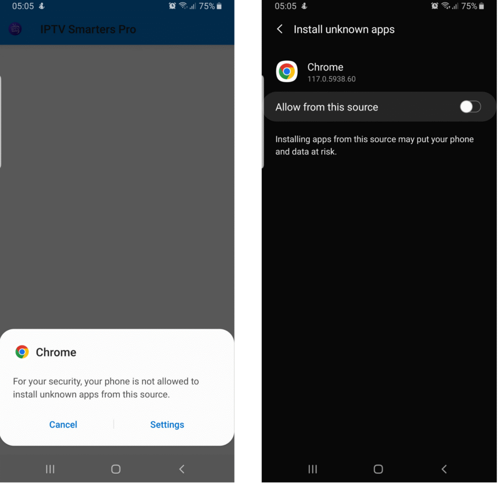 Step 4: Allow installation from unknown sources when prompted by changing and toggling on the “install unknown apps” for your browser